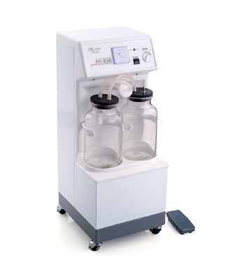 A high-capacity, high-power suction machine for general surgical use. The 7A-23B (High-Power) features an oil-free, maintenance-free suction pump with 40 LPM capacity. Maximum negative pressure can be conveniently controlled from the regulator on the front panel. The durable, aesthetically designed body features a storage compartment at the back and is made from powder-coated metal and plastic. It comes with 2 glass jars, a foot-switch, a tubing kit and spare bacterial filters.